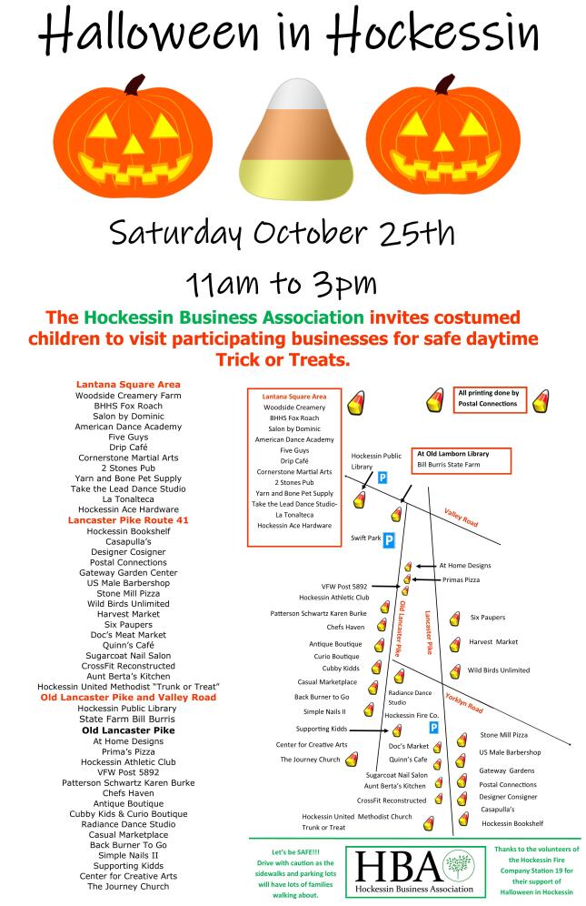 Businesses in Hockessin open the doors for trick or treat to costumed children. Expect hundreds of families walking the streets and parking lots of Hockessin for this daytime event. Please drive carefully everyday.
