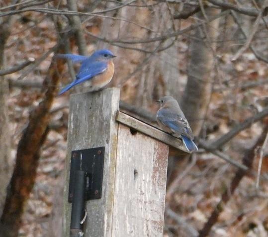 Spring courtship of Bluebirds is delightful to observe. The male will warble his heart out to attract a female. Sometimes he will be atop a bird house or perched nearby a house singing for attention. If a female responds to his overtures, she might inspect the house by going in and out of the house repeatedly. You also might witness a courtship display called wing waving. The male will sit atop the nest box and flick a wing or two open.